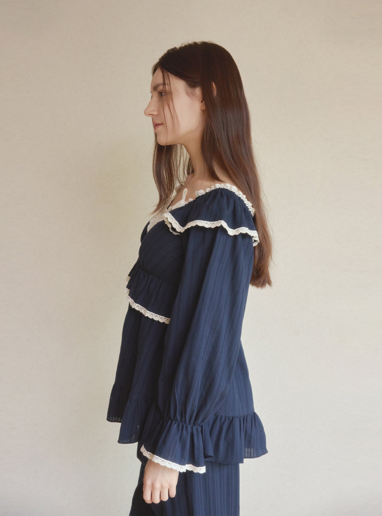 A refined and elegant pajama set featuring a beautiful neckline and a gracefully shaped bust line.