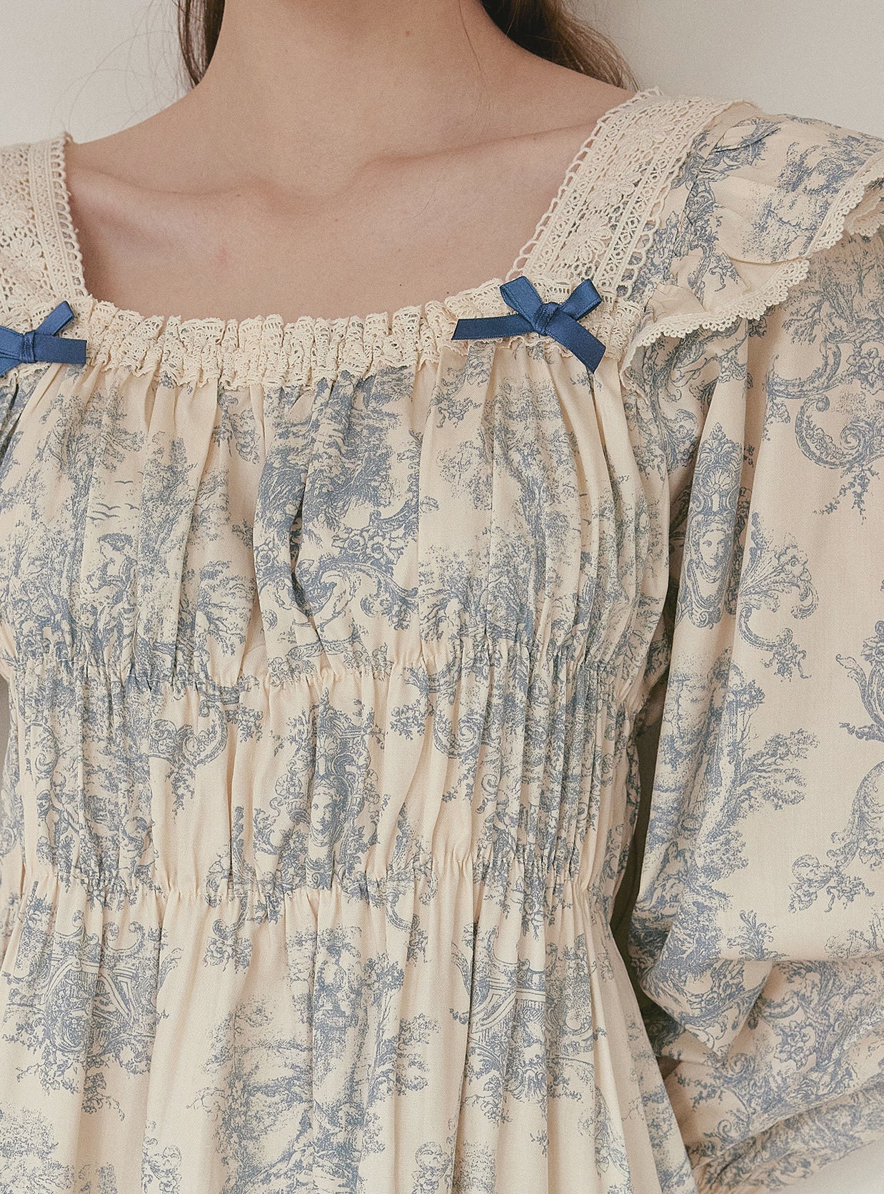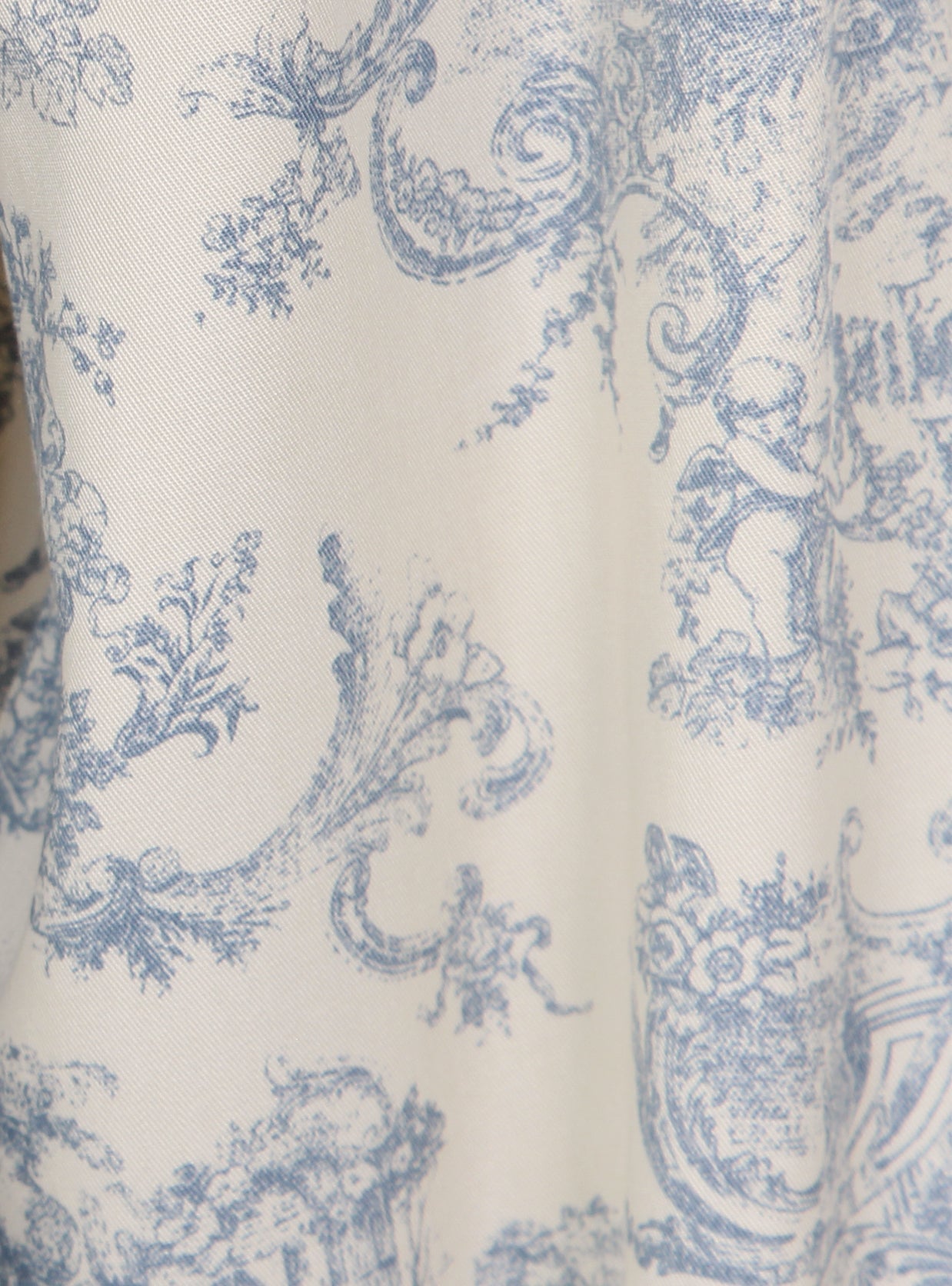 Delicate shirring details add elegance without discomfort, and the premium printing blends harmoniously with each color — Blue Pattern and Pink Pattern — for a refined, luxurious finish. Perfect for those who seek soft textures, feminine details, and elevated homewear.