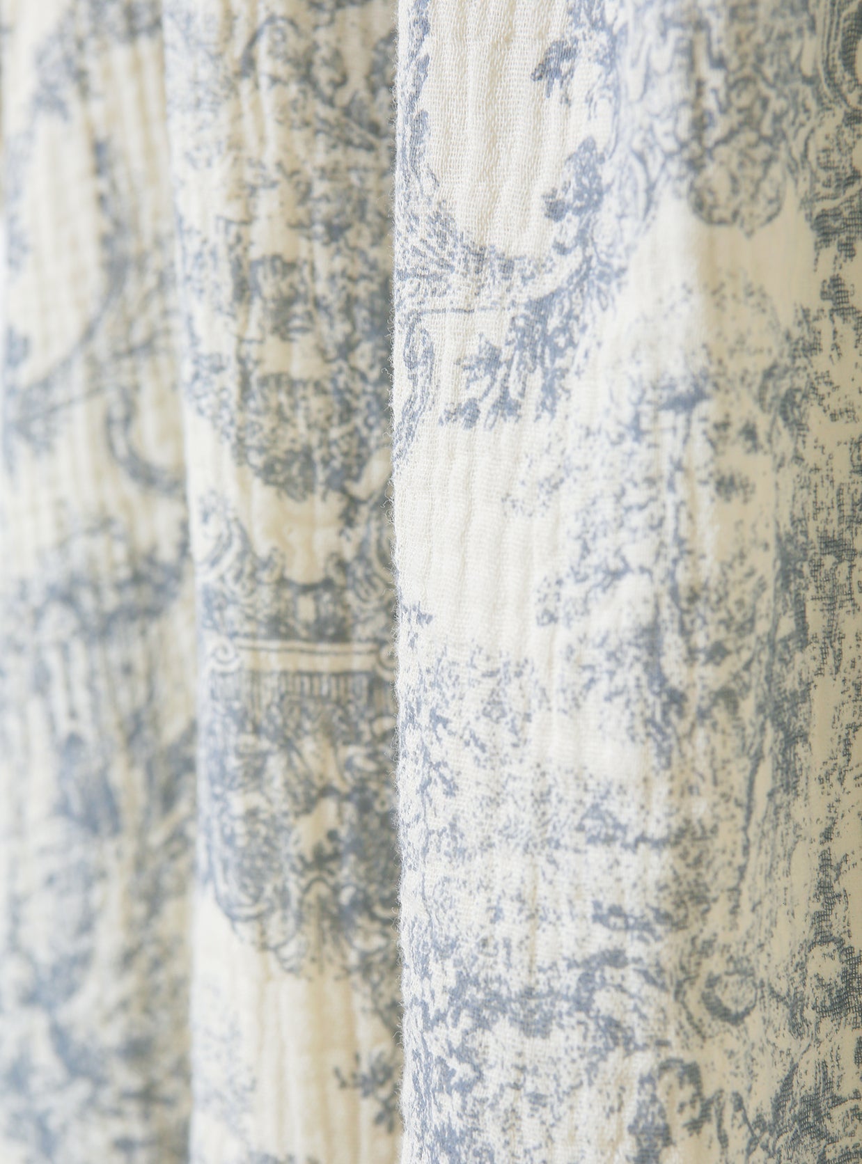 A breathable double-gauze cotton pajama set featuring natural crinkle texture and a romantic toile pattern layered over soft cotton.