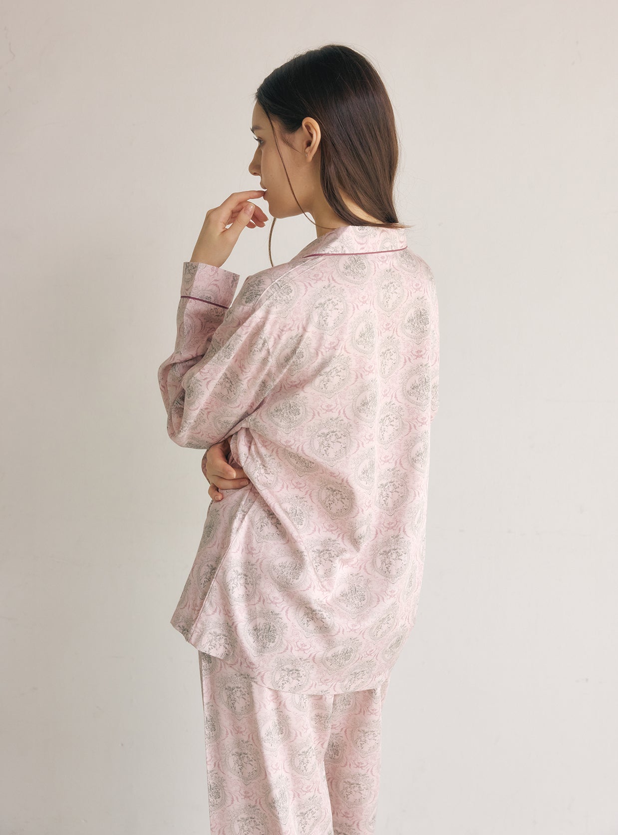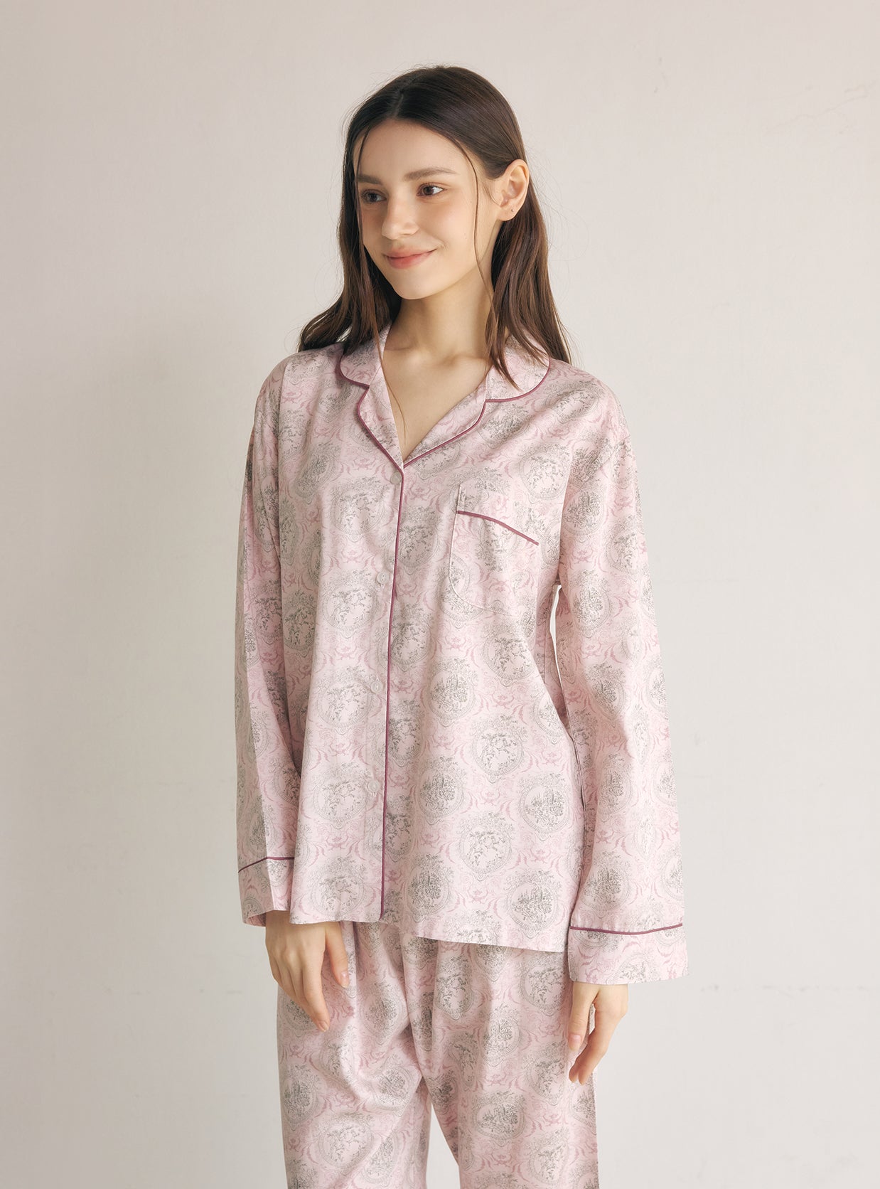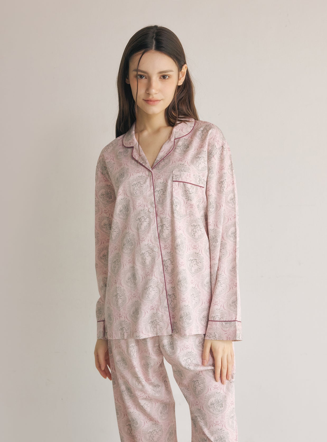 The long-sleeve collared top paired with relaxed-fit pants creates a polished yet feminine homewear style suitable for any season.